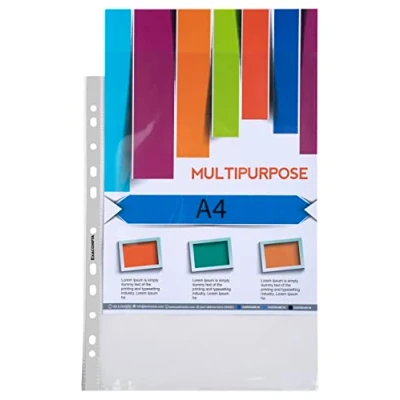 Pack of 100 Punched Pockets Smooth, High Quality - Insert Documents from the Top of the Pouch Perforation: European 11 holes with white plastic reinforcement strip to resist handling and suitable for ring binders and lever arch files Material: 7.5/100th thick smooth polypropylene, the pouches of the bag are transparent and smooth. They are anti-fingerprint and anti-glare, for improved comfort of use, and allow for everyday use Size: the size of the sleeves, slightly larger than A4, is specially designed for A4 documents to fit correctly and easily – Dimensions: 23 x 30.5 cm Packaging: in a bag of 100 perforated pockets. 100% made in France