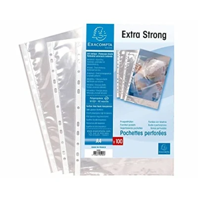 Box of 10 bags of 100 colourless punched pockets - Document insertion from the top of the sleeve Perforation: European 11 hole with reinforcement band to withstand handling and suitable for lever arch files and binders Material: 9/100 thick smooth polypropylene. High resistance for intensive use. The pockets of the bag are transparent and perfectly smooth. They allow for better readability of documents Format: The format of the pockets, slightly larger than the A4 format, is specially designed so that A4 documents fit correctly and easily. Dimensions: 23 x 30.5 cm Packaging: Box of 1000 perforated pockets – Made in France – crystal colour