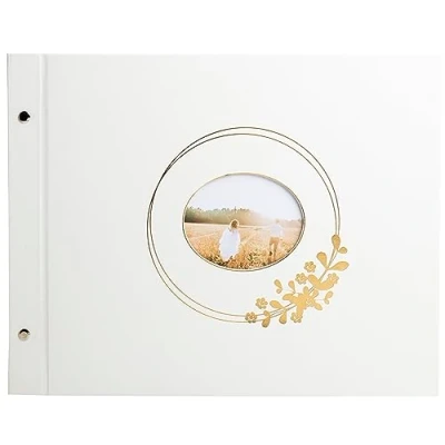 Design and window around the country/floral wedding theme, with the elliptical shape design and golden flowers Cover: white PU effect material with gold marking and oval customisation window with visual in accordance with the theme Quality: the inner pages of the album are made of very high quality rigid white card 250 g for excellent preservation of the pictures, even when gluing on both sides thanks to its protective crystal sheets Capacity: 160 photos 10 x 15 cm - 40 white pages Size: 37 x 29 cm – screw album – Manufacturing: the design of the album is created in Paris and this highly ecological product is 100% made in our factories in France