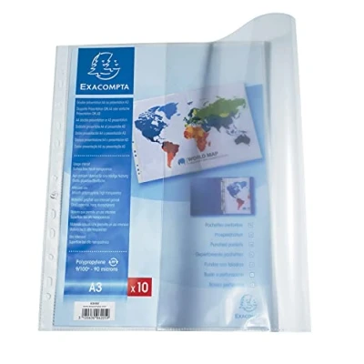 Exacompta Ref 6205E PP Document Punched Pockets Suitable for A3 Folded Documents, 0.1mm Polypropylene, Top Opening Pre Left Tab Clear (Pack of 10)