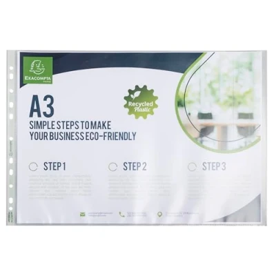Box of 5 bags of 10 perforated pouches colourless grained recycled top quality. Insert documents from the top of the sleeve. Recycled reinforcement strip with a slightly green tint to mark the ecological side of the product. Perforation: European 11 hole with white plastic reinforcement strip to withstand handling and suitable for ring binders and lever arch files Material: These pouches are made from 100% recycled polypropylene from post-consumer waste that has been collected and sorted. High quality 9/100th thickness, beautiful transparency, recycled reinforcement strip Dimensions: 33 cm x 46.5 cm, A3 size Packaging: cardboard with 50 perforated pockets - Blue Angel certification - translucent crystal colour