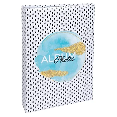 This large and trendy pocket album with its gradient of blue, black and white speckled patterns and gold glitter will allow you to have both a decorative object and a very useful ally to classify your photos effortlessly. Cover: printed paper covered with a glossy protective film to ensure excellent impact resistance and durability over time. QUALITY: The inner pages are printed in light grey with space to caption each photo; pockets with photo insert from the side, no need to stick them. Capacity: 300 photos 10 x 15 cm - 100 pages Size: 22.5 x 32.5 cm