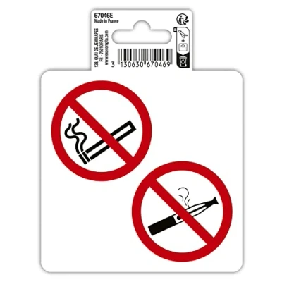 Combination sign prohibiting cigarette and e-cigarette indicate that it is formally prohibited from smoking in collective places Indicates that it is formally prohibited from smoking in places affected by collective use Perfect for communicating in public places or offices. Dimensions and backings: 10 x 10 cm, self-adhesive vinyl Made in France, packaged with slot for hanging