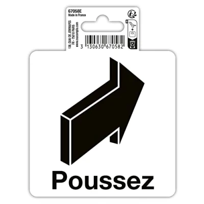 Push pictogram to clearly show users the direction of opening a door Stick to a clean and smooth surface on each side of your front door Ideal for indoor or outdoor use - Can be used for office doors, commercial doors, hotels, restaurants, nightclubs etc DIMENSIONS AND SUPPORTS: 10 x 10 cm - Adhesive Vinyl Made in France - Packaging with a slot to hang the product