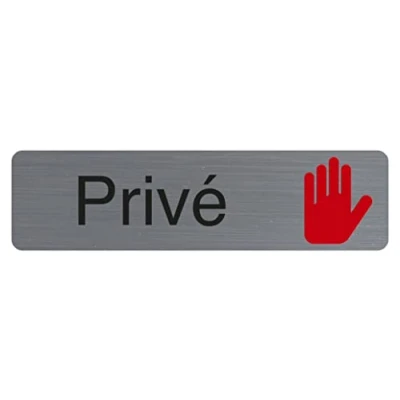 Modern and resolutely elegant design for this 'Privé' adhesive door sign Clear and universal pictogram for a perfect understanding of everyone, showing the presence of a private place Rectangular sign consisting of private symbol and text for indoor and outdoor use Dimensions and supports: 16.5 x 4.3 cm, printed on a 8 mm thick base, brushed aluminium look, self-adhesive, it can be easily and quickly attached to all types of surfaces Made in France, packaged with slot for hanging