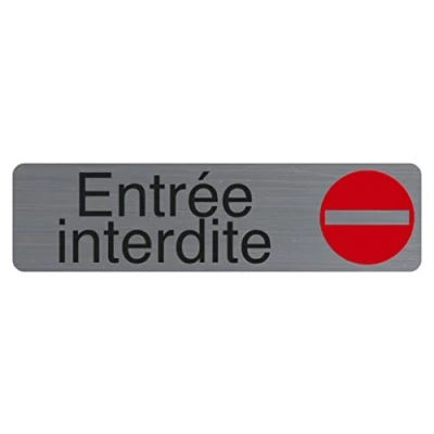 Modern and resolutely elegant design for this "Entrée Prohibitite" adhesive door sign Clear and universal pictogram for a perfect understanding of all Rectangular sign made up of the prohibited symbol and text. For indoor and outdoor use Dimensions and supports: 16.5 x 4.3 cm, printed on a 8 mm thick base, brushed aluminium look, self-adhesive, it can be easily and quickly attached to all types of surfaces Made in France, packaged with slot for hanging