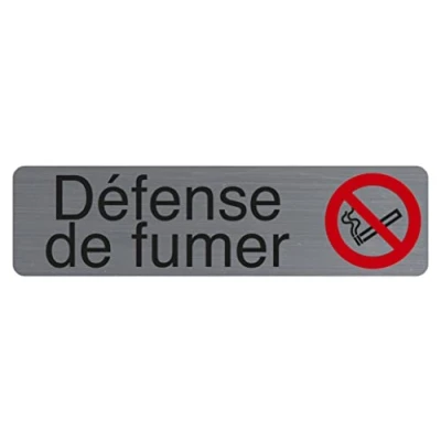 Smoking Defense Door Sign indicates that it is formally prohibited from smoking in places affected by collective use Clear and universal pictogram for a perfect understanding of all Smoking Defence Rectangular Sign - Indoor and Outdoor Use Dimensions and supports: 16.5 x 4.3 cm, printed on a 8 mm thick base, brushed aluminium look, self-adhesive, it can be easily and quickly attached to all types of surfaces Made in France, packaged with slot for hanging