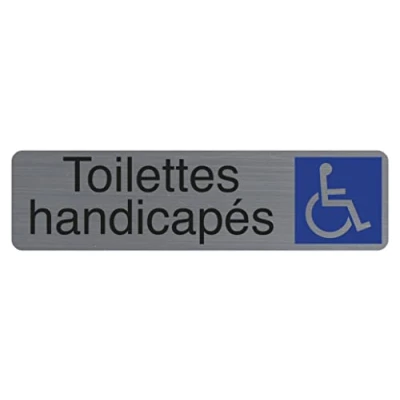 Modern and resolutely elegant design for this "Disabled Toilettes" adhesive door sign Clear and universal pictogram for a perfect understanding of all Rectangular sign with the Disabled Toilets symbol for indoor and outdoor use Dimensions and supports: 16.5 x 4.3 cm, printed on a 8 mm thick base, brushed aluminium look, self-adhesive, it can be easily and quickly attached to all types of surfaces Made in France, packaged with slot for hanging