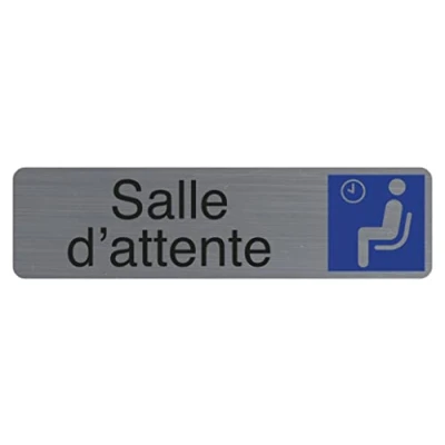 Modern and resolutely elegant design for this "Salle d'wait" adhesive door sign Thanks to your waiting room door sign, the information is doubled by the word and the "waiting room" pictogram to facilitate understanding. Rectangular sign with symbol and text "Waiting Room" for indoor and outdoor use Dimensions and supports: 16.5 x 4.3 cm, printed on a 8 mm thick base, brushed aluminium look, self-adhesive, it can be easily and quickly attached to all types of surfaces Made in France, packaged with slot for hanging