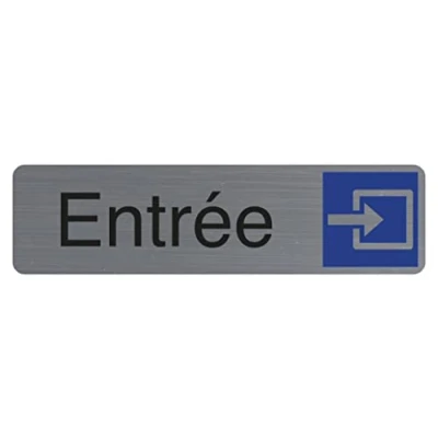 Modern and resolutely elegant design for this "Entrance" adhesive door sign Clear and universal pictogram for a perfect understanding of all Composite rectangular plate. Entrance with inner arrow. For indoor and outdoor use Dimensions and supports: 16.5 x 4.3 cm, printed on a 8 mm thick base, brushed aluminium look, self-adhesive, it can be easily and quickly attached to all types of surfaces Made in France, packaged with slot for hanging