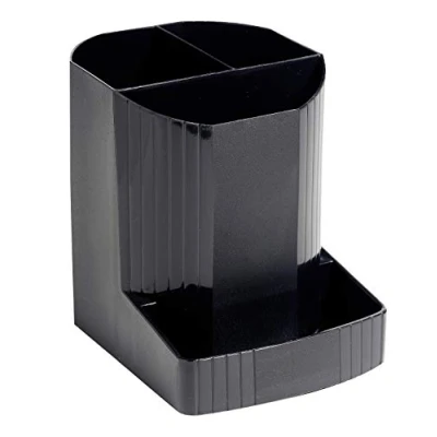 Space saving pen pot for your favourite pens and pencils etc Storage space for staples, paperclips, pins and other accessories 123 x 90 x 11 mm in size 3 compartments in different heights and sizes Made from recycled PP and Blue Angel certified. Comes with a 5-year warranty