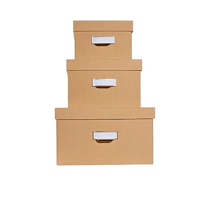 OFFICE BY ME NEST BOXES are made from recycled cardboard, covered with textile effect paper, a plant monomaterial that facilitates recycling - A zero plastic range that carries the values of the brand 3 sizes: Large format: A4+ for filing folders and folders with elastic - Medium format: A5++ for accessories, notebooks - Small size: A6++ for small storage Dimensions: Large size: 26 x 35 x 15 cm. Medium size: 20 x 26 x 13 cm. Small size: 16 x 20 x 11 cm Label holder with rim for better grip - Double-sided label allows you to identify contents Colour: beige - set of 3 boxes