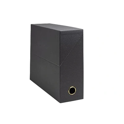 FSC certified OFFICE BY ME transfer box made from recycled cardboard, covered with textile effect paper Reinforced flap lid keeps the box tightly closed, reinforced interior with cloth band CAPACITY: The 90 mm transfer box on the back holds up to 800 sheets (80 g paper) - Colour: black Dimensions: 25.5 x 34 x 9 cm, 90 mm spine, adhesive label provided to identify the product Assembly: delivered assembled – with refined paper and its gold grip eyelet, it is also a beautiful object that finds its place in professional or personal cabinets.