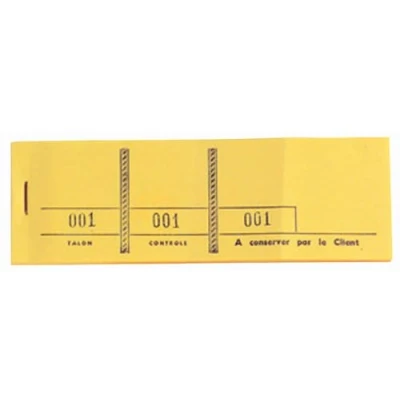 Box of 50 blocks ideal for events with double control exhibitions to account for entry or sales of products, or for fairs, lotteries, raffles Block of 100 sheets, in packs of 10 blocks whose sheets are numbered from 1 to 1000 Each sheet is composed of 3 coupons, 2 of which can be detached thanks to microperforations: stump, control and customer Size: 4.8 x 15 cm Made in France - leaf colour: yellow - Sold in cardboard of 50 blocks