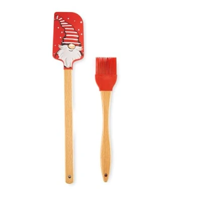 Excelsa 68561 Silicone Spatula and Brush Set, Christmas Beech, Decorative gnome with Wooden Handle