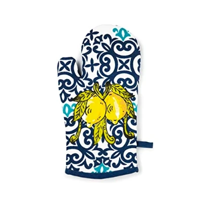 The glove is made from 100% cotton 200 g. The filling is made from 100% polyester. Removing or inserting hot pans and pans from oven or stove will no longer be a problem with the oven mitt of Excelsa One size fits all: the size of cm. 32.5 x 16.5 x H.2 make it suitable for each user Front Amalfi decoration, border, back and blue buttonhole Machine washable at 40°C. Do not bleach, iron at a maximum temperature of 110°C, do not tumble dry. Do not dry clean. Wash separately to preserve other garments from colour loss The item is equipped with a convenient loop that allows you to hang the glove on common kitchen hooks