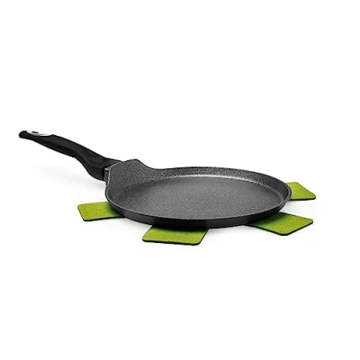 Plate multiusio thick forged aluminium. Ideal for crepes/frittate/Pancake/. Diameter: 25 cm With soft touch silicone handle for a secure grip 5-layer non-stick coating with mineral particles Ideal for cooking on any cooktop, including induction Dishwasher safe. salvapadelle included.