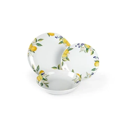 18-piece dinner set for serving up to 6 people: the Lemon dinner set by Excelsa consists of 18 pieces and thanks to its decorations with summer notes and citrus is ideal for recreating the atmosphere of the Italian coasts on your table, making it perfect for outdoor dinners with friends or to go on a holiday in Southern Italy during lunches and dinners. of every day DESIGN: The set is decorated with lemons, flowers, leaves and blueberries, so you can bring to your table the flavors and scents of summer; the dishes are also characterized by the use of soft and refined colours. You can use these plates to serve a full meal, from appetizer to dessert, adding the freshness and scents of citrus to every course DAILY USE: The Lemon plate service is also ideal for everyday use as it is dishwasher safe. It can also be used in the microwave for quick and easy heating Composition: the dinner set is entirely made of porcelain and includes 6 dinner plates Ø 24 cm and height 2.5 cm; 6 soup plates diameter 20.5 cm and height 5 cm; 6 fruit plates diameter 19 cm and height 2 cm