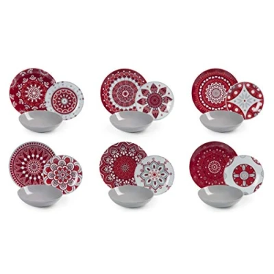 18-piece dinner set for serving up to 6 people: Excelsa Mandala Red dinner set consists of 18 pieces, made of decorated porcelain (dinner plates and fruit plates) and stoneware (soup plates) and is suitable for any occasion. Bright colors and geometric mandala-inspired decorations will bring an ethnic and charming touch to your table whether for casual occasions, such as everyday lunches and dinners, or for parties and dinners with friends DESIGN: The set is decorated with mandala, oriental geometric designs with strong symbolic value, red and white hues that recall passion, infinity and freedom, so as to bring to your table a magical and charming atmosphere, strong spiritual echoes. You can use this service to serve a complete meal, from appetizer to dessert, enhancing every course to the best and making the table seats personalized and always different: thanks to the uniqueness of each dish and the bright colours you can amaze your guests with a place always new and original table DAILY USE: The Mandala dinner set is ideal for everyday use as it is washed in the dishwasher without losing the brilliance of the colours. It can also be used in the microwave for quick and easy heating Composition: the dinner set includes 6 porcelain dinner plates Ø 27 cm and height 3 cm; 6 stoneware soup plates diameter 20.5 cm and height 5.5 cm; 6 porcelain fruit plates diameter 20.5 cm and height 2.5 cm