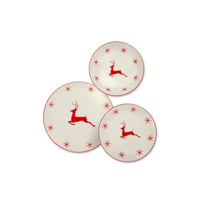 Complete set: 18-piece porcelain set with elegant Christmas reindeer and red snowflakes on a white background Composition: includes dinner plates (diameter 27 cm), soup plates (diameter 20.5 cm) and dessert plates (diameter 20.5 cm) for a complete service DECORATION: Refined undercoat design made with pad printing technique, which makes each piece unique with slightly different shades MATERIAL: Made of high quality porcelain, strong and durable for daily use CONVENIENCE: Dishwasher and microwave safe for convenience of use