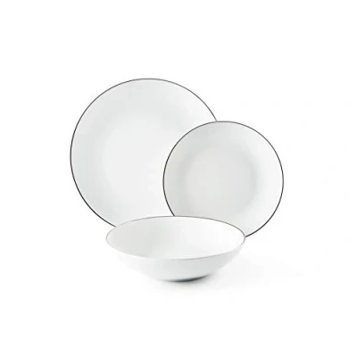 18-piece table set; ideal for serving up to 6 people Set consisting of: 6 dinner plates, 6 soup plates and 6 fruit plates Dimensions: diameter plates cm.27 x h. 2.5, diameter plates bottoms cm.20 x h. 5, fruit plates diameter cm.20 x h. 2.5 Material: Porcelain Plates 2mm Silver Edge Not dishwasher and microwave safe.