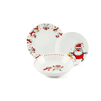 18 PIECE PLATE SERVICE, FOR SERVING UP TO 6 PEOPLE: Excelsa Snowman dinner set consists of 18 pieces and is suitable for bringing the Christmas atmosphere to your table, making it perfect for festive occasions with relatives or to extend the festive spirit even during everyday lunches and dinners Design: the service is characterized by a classic cut and the undisputed protagonists of the decorations are Santa Claus and a cute snowman, available in various poses and sizes and that together will transmit joy and good mood to your table, as well as immediately recall the magical and festive atmosphere of Christmas, without sacrificing a touch of sympathy and originality. You can use these plates to serve a full meal, from appetizer to dessert, enriching every course of Christmas spirit DAILY USE: The Snowman dinner set is also ideal for everyday use as it is dishwasher safe. It can also be used in the microwave for quick and easy heating Composition: the dinner set is made entirely of porcelain and includes 6 dinner plates Ø 25 cm and height 2.5 cm; 6 soup plates diameter 20.5 cm and height 4 cm; 6 fruit plates diameter 19 cm and height 2 cm