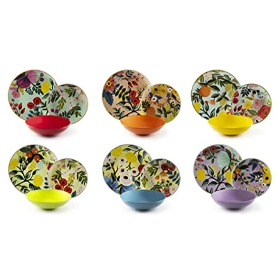 18-piece dinner set for serving up to 6 people: Excelsa Fiori Frida dinner set consists of 18 pieces and is suitable for any occasion. The pastel colours and floral designs inspired by the paintings of the painter to whom the service is dedicated will make your table perfect for both casual occasions, such as everyday lunches and dinners as well as for parties and dinners with friends DESIGN: The set is decorated with patterns inspired by Frida Kahlo paintings to bring wild buds, buttercups and summer fruits to the table in naive style, creating a strong and original atmosphere with dreamy and romantic notes and a touch of Mexican folklore. You can use this service to serve a complete meal, from appetizer to dessert, enhancing every course to the best and making the table seats personalized and always different: thanks to the uniqueness of each dish and the bright colours you can amaze your guests with a place always new and original table DAILY USE: The Fiori Frida dish set is ideal for everyday use as it is washed in the dishwasher without losing the brilliance of the colours. It can also be used in the microwave for quick and easy heating Composition: the dinner set includes 6 porcelain dinner plates Ø 27 cm and height 3 cm; 6 stoneware soup plates diameter 20.5 cm and height 5 cm; 6 porcelain fruit plates diameter 20 cm and height 2 cm