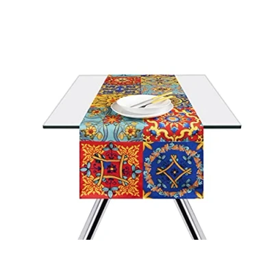 Narrow table runner perfect for any situation and thanks to the size of 45 x 140 cm, fits on any table Made of 100% high quality cotton with 200 grams for long lasting use. Trinacria table runner inspired by Sicilian culture and bold colours. Machine washable up to 40°C to preserve colour and quality. Do not dry clean. Do not bleach. Iron at a low temperature. Do not tumble dry