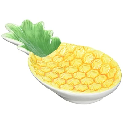 Line: Tropical Pineapple Shaped Spoon Plate Made of ceramic and hand painted Dimensions: 27 x 12.5 x H 3 cm. Dishwasher and microwave safe