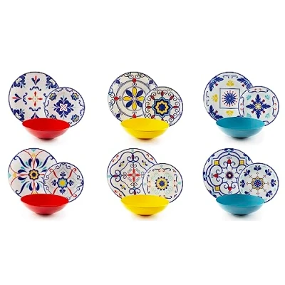 HIGH QUALITY MATERIALS - Made with premium porcelain for dinner plates and fruit plates, and durable stoneware ceramic for soup plates, offering a stylish, sturdy and versatile experience Ideal size: the dinner plates have a diameter of 27 cm, a height of 3 cm and a weight of 710 grams, the soup plates have a diameter of 20.5 cm, a height of 5.5 cm and a weight of 505 grams, while the fruit plates have a diameter of 20.5 cm, a height of 2.5 cm and a weight of 340 g. Well balanced plate sizes provide a perfect presentation for every course Dinner plates and fruit with Vietri Color decoration, solid colour soup plates in 3 assorted colours: two red, two yellow and two light blue CONVENIENCE WITHOUT COMMISSION - The dishes in this set are safe to use in both dishwasher and microwave, offering maximum convenience without compromising on the quality or integrity of the dishes VERSATILE FOR ANY OCCASION AND PERFECT FOR 6 PEOPLE - This set of plates offers unparalleled versatility, adapting to any type of event, whether it's a formal dinner or a casual lunch. In addition, it is designed to meet the needs of a family or group of 6, offering a complete and coordinated service for every diner