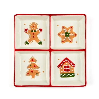 CHRISTMAS DESIGN: Ceramic tray plate decorated with Christmas gingerbread motifs including little man, tree, house and snowflake PERFECT SIZE: Measures 20x20cm with four separate compartments, ideal for serving different types of snacks and treats VERSATILITY OF USE: Perfect for serving pickles, olives, pretzels or biscuits from breakfast to aperitif during festivals PRECIOUS MATERIAL: Made of high quality ceramic with hand-painted decorations and embossed elements GIFT BOX: Presented in an elegant lithographed box, great as a Christmas gift