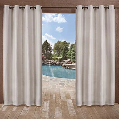 Heavy duty outdoor panels are a water repellant, mildew resistant polyester fabric Set includes: Two (2) curtain panels 8 Stainless Steel rust proof silver grommets per panel; inside diameter for curtain rod measures 1-5/8" - panel sewn with 4" heading; 3" bottom hem