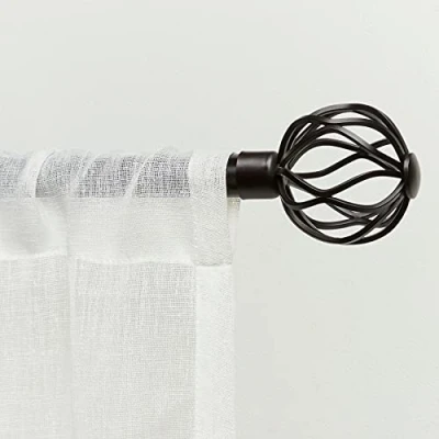 The Ogee matte bronze curtain rod and finial set has an open, airy design with wavy iron strand sphere shape finials Features two (2) wavy iron strands 2.5" diameter finials 1" iron rod designed for small to medium windows, adjusts from 36" to 72", capable of supporting heavier fabrics up to 25 lbs. Set includes: rod, two (2) finials, two (2) fixed 3.5" depth projection brackets, mounting hardware, and installation instructions Easy care: wipe clean with dry cloth; avoid household cleaners and harsh abrasives