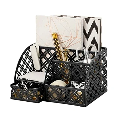 Mesh metal desk organiser with seven compartments, including one pull out drawer; Made of quality mesh metal – durable, compact and smart-looking; Compartments are in various size and shape – easy to keep pens, sticky notes, paper clips etc all in one place; also good for organising makeups and small household items; A versatile accessory for office or home, available in black, silver, pink and blue to suit most of colour schemes; Dimensions: 22 cm (L) x 14.2 cm (W) x 12.5 cm (H).