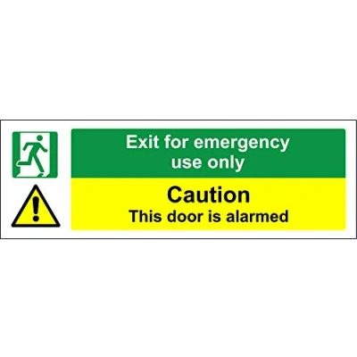 Exit for emergency use only caution this door is alarmed safety Self adhesive sticker 300mm x 100mm