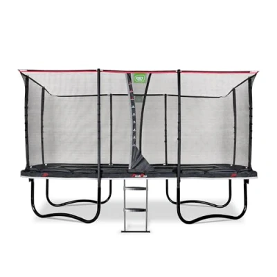 ManoManoGeneral description The EXIT PeakPro trampoline with safety net is a rectangular trampoline designed for experienced jumpers. It features a sleek black frame with mat black protection padding, providing a robust look and a comfortable bounce. The trampoline includes a ladder for easy access and a safety net with a jump measuring scale to track your jumping height. Technical specifications Dimensions: 8x14 ft Spring length: 9.84 inches Frame: Galvanised and powder coated Installation Includes a ladder for easy access Usage Suitable for children who are experienced jumpers Safety net and padding protect against falls Special foot protection system prevents feet from getting caught in springs