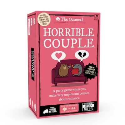 How To Play: You'll compete to create a love story fit for a classic dark comedy. In Horrible Couple, you'll build purposefully ridiculous comics starting with a Question card, then a Response card, and topped off with a ludicrous Compromise card. Play as a couple or with friends, cooperatively or competitively. Nothing says date night like a little chaos! More Horrible Than Ever: Packed with 10 new cards and an exclusive Playmat, you're getting 57 Question cards, 140 Response cards, 183 Compromise cards to create endless comics. No Couple? No Problem: You can play with just two or add up to eight degenerates who don't mind laughing at love gone wrong. Be Horrible Anywhere: Take Horrible Couple anywhere you have space to spice up the romance with a comic about sexy handcuffs. From an intimate, funny date night game to full on game night , it’s always ready to stir up fun. From the folks that brought you Exploding Kittens: Exploding Kittens believes in making games that make your friends and family more entertaining! From kids games, teen games, to adult games, it's a mission we've committed to for 10 years and counting!, Manufacturer: Exploding Kittens