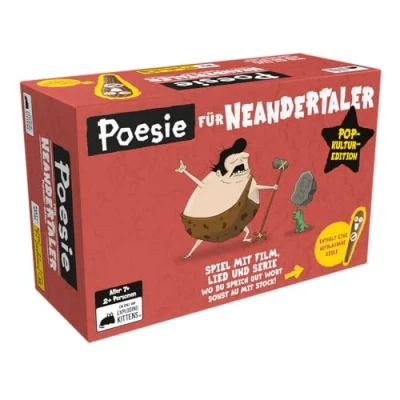 Poetry for Neanderthals Pop Culture Edition is a fun pun with the typical humour from Exploding Kittens. Whether big or small, everyone has fun with the funky party game. Includes 200 double sided poetry cards with exclusively pop cultural terms such as "Titanic" or "The White Shark" Forms 2 equal sized teams. If there are an odd number of players, one is the referee. As a Neanderthal poet, you have to explain terms to your team members, but only with monosyllable words The opposing team receives the Nö! club and makes sure that the poet only uses words with a syllable. If not, uses the club and reminds him that he is only a Neanderthal Guess as many terms as possible in the team before your time runs out and send your opponents back to the caves. The team that has earned the most points wins the game 2+ players, ages 7+, 15 minutes playing time per game, authors: Francesca Slade and Jacob Matthews, game in German, Manufacturer: Exploding Kittens
