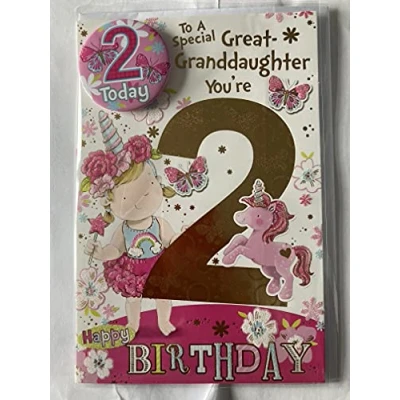 Adorable animated design featuring a little girl and unicorn Perfect for sending birthday wishes and showing your love and affection for your great granddaughter Includes a badge that your great granddaughter can wear proudly to celebrate her special day Card measures 22.8 x 15.3 cm and comes with an envelope for easy mailing Crafted from high-quality materials for durability and long-lasting use