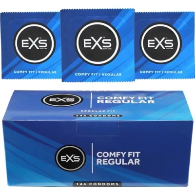 REGULAR - The Regular condoms are flared, and teat ended, suitable for most men to use with confidence. WHAT - EXS condoms are a teat ended, natural latex, silicone lubricated condoms. Unlike many condoms, EXS condoms do not have a latex smell, maximising your pleasure. SIZE - Width: 54mm, Thickness: 0.073mm and Length: 192mm. Pack contains 144 condoms. VEGAN-FRIENDLY & CRUELTY-FREE - We have and always will be vegan friendly. We take great pride in being cruelty-free with no animal testing whatsoever. WHY EXS - If you think condoms get in the way then you are buying the wrong ones, try our range of products. We are the UK's largest independent condom supplier for a reason! Please note packaging may vary.
