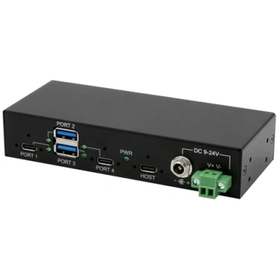 Metal USB 3.2 (Gen2) HUB with 2 USB-C ports + 2 USB-A ports 15KV ESD surge protection for each output Up to 2.5A per port Automatic detection of data transfer rate Metal enclosure for wall or rack mounting