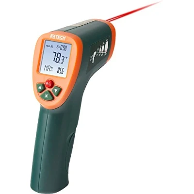 Take non-contact temperature measurements from -4 to 1202°F (-20 to 650°C 12: 1 distance to spot (target) ratio Built-in laser pointer identifies target area with on/off button Programmable Hi/Low alarms with audible beeper — tri-color LCD display changes to Blue backlight when reading goes below low alarm setting and Red backlight when reading exceeds High set point Adjustable emissivity (0.10 to 1.00) increases measurement accuracy