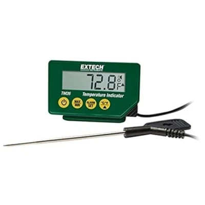 NSF certified for measuring food 4.1" (105mm) stainless steel penetration probe with 5ft (1.5m) cable Measures temperature from -40°f to 392°f (-40°c to 200°c) Audible and visual alarm alerts When temperature level is higher or lower than the user programmed high/low set points LCD displays temperature reading, alarm indicator and high or low alarm icons, Weight: 0.2 pounds, Manufacturer: Extech