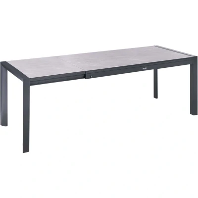 HPL Outdoor Table with Metal Frame. A modern outdoor table with a minimalist design, perfect for terraces and garden spaces. The tabletop is made of HPL, known for its exceptional durability, resistance to scratches, moisture, and high temperatures. The lightweight yet sturdy aluminum frame ensures corrosion resistance and long-lasting performance outdoors. The table is extendable, allowing easy adjustment to the number of guests. It is resistant to UV radiation, water, wind, and rust, making it ideal for year-round outdoor use. Details: Product Type: Dining Table General Color: Grey, Black Frame Colour: Grey Material Type: Synthetic Material Main Material: High Pressure Laminate (HPL) Additional Material: Aluminium Legs material: Metal Top Material: Synthetic Material Shape: Rectangular Finish: Powder Coated Seats Up To: 8 People Dimensions: Width: 90 cm Length: 160/220 cm Height: 75 cm Weight: 52 kg Weight Capacity: 75 kg Offer Includes: 1 x Table Key Features: Modern Patio and