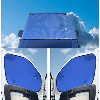 IMPORTANT INFORMATION The main image is generic it demonstartes how the blind fits IN SUMMER Keeps the interior cooler. Prevents sun bleaching of the vehicle interior fabric. Acts as a black out thus easier to sleep. Maintains privacy IN WINTER. Retains Heat thus keeping the interior warmer. Prevents condensation. Prevents sun bleaching of the vehicle interior fabric. Acts as a black out thus easier to sleep. Maintains privacy These thermal blinds utilise a unique material that has been used for years for controlling core temperatures of products during logistical transit in the pharmaceutical trade .These thermal blinds use a twin foil backed fabric coated material which has pockets of air trapped within - depending on which way the blinds face will either retain heat or keep cool. The trapped air pockets delivers the desired effect. The Blinds attach to the vehicle using magnetic clips which fix to body of the Vehicle. The front blind can be removed to allow sunlight to enter
