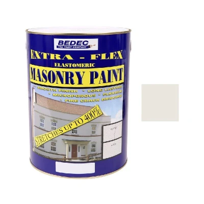 General description Bedec Extra-Flex Masonry Paint in Swans Down is an elastomeric masonry paint designed to protect and enhance exterior surfaces such as masonry, roughcast, pebble-dash, brickwork, cement, and concrete. This flexible, microporous coating stretches up to 400% to accommodate substrate movement, preventing cracking that often occurs with conventional masonry paints. It is suitable for application on previously painted surfaces after proper preparation. Technical specifications Type: Modified acrylic blend Finish: Smooth Coverage: Approximately 9-11 sq meters/litre per coat when applied by brush or roller Volume: 5 Litres Installation Application methods: Brush, roller, or spray Quick drying: Yes Usage Ideal for exterior masonry surfaces Flexible and microporous, allowing for movement without cracking