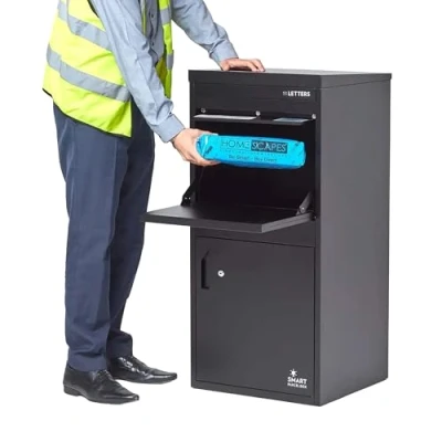 General description The Smart Parcel Box® Extra Large Free Standing Postal Box is designed for secure parcel deliveries when you are not at home. This extra-large drop box allows for multiple deliveries from various couriers daily, making online shopping more convenient. Your packages are delivered into a secure holding compartment, ensuring they remain safe until you return home. It features a unique barcode for couriers to scan as proof of delivery and an anti-fishing design to protect your parcels. Technical specifications Brand: Smart Parcel Box® Dimensions: W 485 x D 455 x H 1025 mm Colour: Black, Grey, Green, Red Material: Galvanised Steel Lockable: Key lock with 3 keys Weather-Resistant: Powder coated with floor raisers Max Parcel Size: 450 x 340 x 260 mm Warranty: Manufacturer's Warranty of up to 3 years Compatibility and accessories Includes a thick PVC cushion for the floor of the box's lower compartment to help cushion parcels upon delivery. Installation The parcel box can