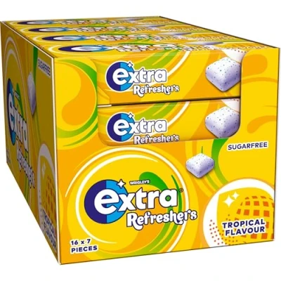 Sugar Free Chewing Gum cube pieces that deliver a hit of refreshing tropical flavour, encased in a crisp shell which gives way to a delicious chewy soft centre Frantic day ahead? Slip a pack of Extra xylitol gum into your bag to stay fresh through whatever adventure the day takes you on. Our Extra chewing gum bulk pack has your back Supercharge your study sessions with a pack of Extra tropical chewing gum tucked away in your desk drawer. When you need a refresh, chew Extra Sugar free chewing gum pieces in a bulk chewing gum pack that is suitable for vegetarians 16 packs of tropical flavoured Extra Refreshers Chewing Gum each pack contains 7 pieces.