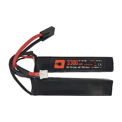 STATS - LiPo | 7.4v | 3300 mAh | 30C/60C @ 99A/198A (Cont/Burst) - Airsoft AEGs use the "Burst" flow rate to start the motor, and then the "Cont" flow rate to provide continuous discharge (check your owners manual to ensure the battery purchased meets the minimum flow rate (C) of your AEG) - this battery provides approximately 2 minutes of continuous discharge before running flat LITHIUM POLYMER - LiPo batteries have an excellent size/weight to capacity ratio, allowing you to fire more shots with a smaller battery. LiPo batteries can be recharged at any charge level without damaging the overall capacity of the battery. LiPo batteries should not be "run-flat", as this can damage the battery and effect overall charge ability. LiPo batteries MUST be charged with a LiPo Balance Charger. LiPo batteries should always be charge in a fire-retardant Safe-Charging-Bag NUNCHUCK - this battery is split to help find its place in small battery compartments. Commonly fitted inside the buttstock of rear wired Airsoft Replicas where the buffer tube is not hollow (example EBB - Electric-Blow-Back AEGs). Also for fitting around the barrel, within the handguard of front wired Airsoft Replicas. Always check the dimensions of the battery vs the battery compartment to ensure compatability MINI TAMIYA - this battery is suitable for Airsoft Replicas using a Mini-Tamiya battery connector QUALITY CONTROL - NP Power batteries are produced at an ISO 9000 Quality Control accredited manufacturing plant and shipped at an optimal charge rate of ≥60% to protect against degradation when in transport/ storage