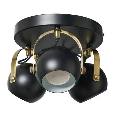 General description Illuminate your home with this sleek 3-light eyeball spotlight in black with stylish satin brass accents. Featuring adjustable spotlight heads and compatibility with GU10 LED bulbs, it offers versatile lighting options for highlighting artwork or accentuating architectural elements, while also being ideal for low ceilings due to the flush type fixture. Technical specifications Product Type: Spotlight Plate Bulbs Required: 3 (Not Included) Bulb Type: GU10 Max Bulb Wattage: 7 Watt Max Bulb Voltage: 240 Volt Light Source: LED Height: 18 cm approx. Diameter: 26 cm approx. Ceiling Cap Diameter: 22 cm approx. Drop: 18 cm approx. Shade Height: 9 cm approx. Shade Diameter: 10 cm approx. Material: Metal Colour: Black, Satin Brass Weight: 1.14 kg